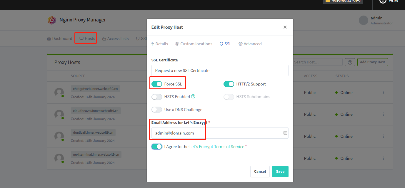 Websoft9 控制台的网关模块中支持可视化的 HTTPS 设置,支持 Let's Encrypt 自动获取证书。