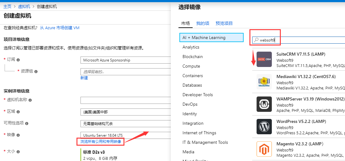 Portal > 创建虚拟机 > 浏览所有镜像,检索关键词 Websoft9 Application Hosting Platform,找到镜像后开始部署