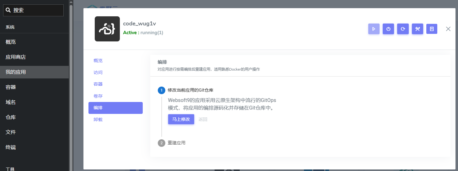 1. 登录 Websoft9 控制台,进入应用的管理界面的 编排 标签页