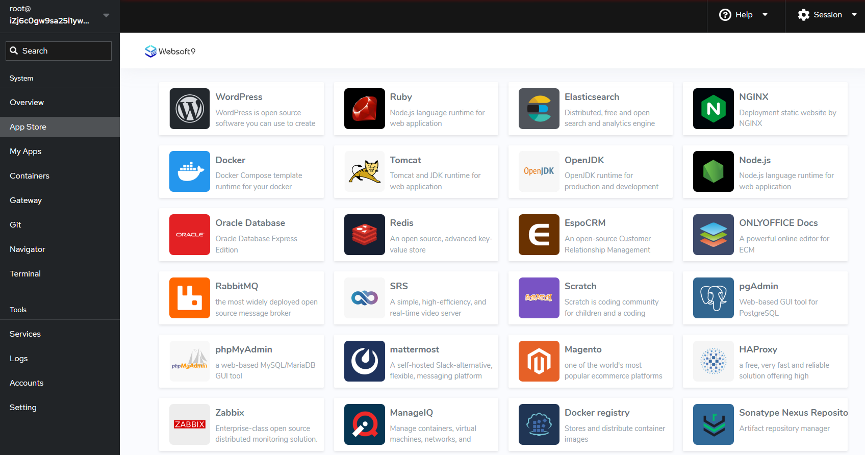 Websoft9 comes with 300+ one-click deployment templates pre-built and supports users' customized deployment of programs such as Java, Python, Node.js, PHP, Go, Ruby and dotNET.