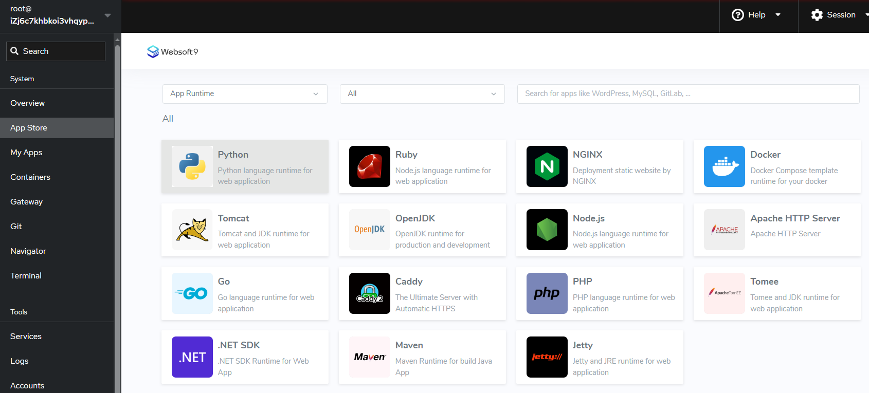 Login to Websoft9 Console, go to the APP Runtime catalog of App Store